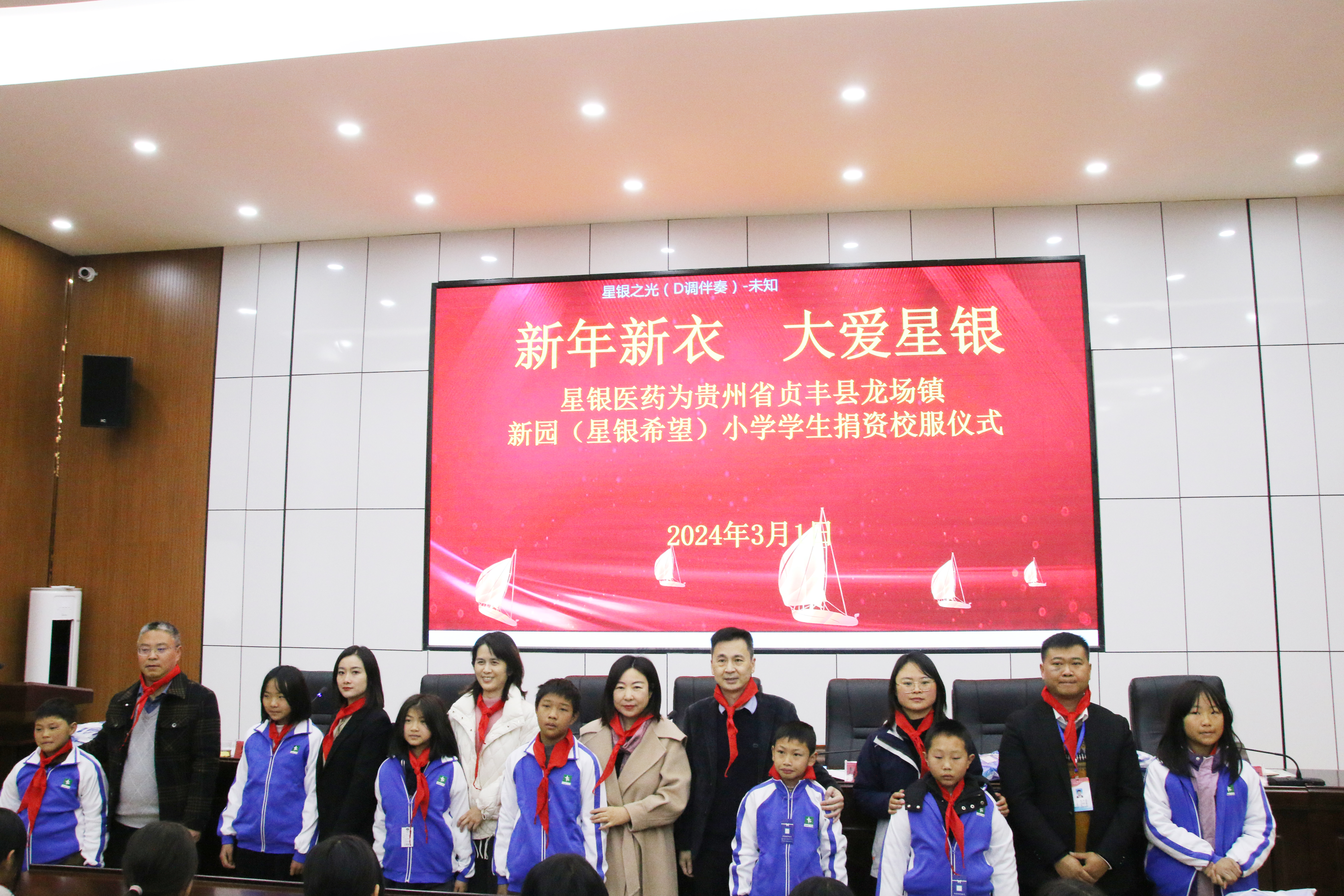 24/06-05春山日暖,萬(wàn)物萌新。3月1日,新學(xué)期開(kāi)學(xué)季,深圳市星銀醫(yī)藥有限公司在貴州省貞豐縣龍場(chǎng)鎮(zhèn)新園(星銀希望)小學(xué)舉辦“新年新衣 大愛(ài)星銀”校服捐贈(zèng)儀式。公司領(lǐng)導(dǎo)、星銀醫(yī)藥工會(huì)、星銀醫(yī)藥黨支部及貴州辦事處相關(guān)人員參加此次愛(ài)心捐贈(zèng)活動(dòng),貴州省貞豐縣龍興街道辦領(lǐng)導(dǎo)、新園小學(xué)全校師生及媒體記者共同見(jiàn)證這溫暖時(shí)刻。